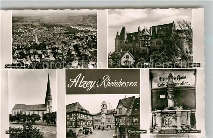 Alzey Fliegeraufnahme Schloss Voelkerbrunnen Fischmarkt Deutsches Haus Fachwerkhaus Kirche Alzey postalisch nicht gelaufen 1921-1965 Erhaltung siehe scans [FriedD77] Frierer
