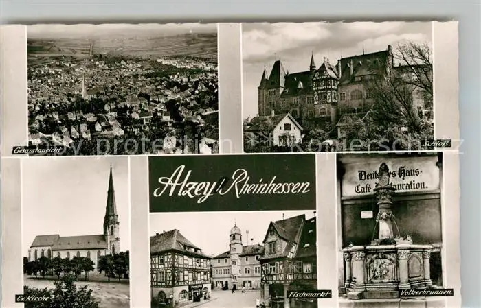 Alzey Fliegeraufnahme Schloss Voelkerbrunnen Fischmarkt Deutsches Haus Fachwerkhaus Kirche Alzey postalisch nicht gelaufen 1921-1965 Erhaltung siehe scans [FriedD77] Frierer
