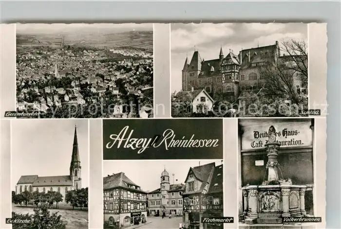 Alzey Fliegeraufnahme Schloss Voelkerbrunnen Fischmarkt Deutsches Haus Fachwerkhaus Kirche Bromsilber Alzey postalisch nicht gelaufen 1921-1965 Erhaltung siehe scans [FriedD77] Frierer