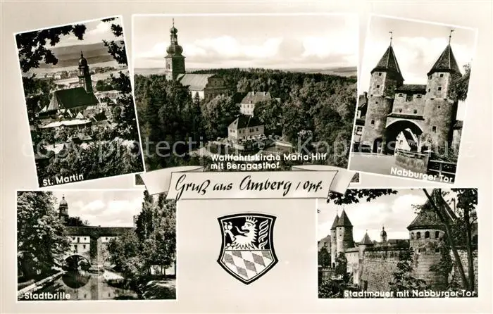Amberg_Oberpfalz St Martin Kirche Wallfahrtskirche Maria Hilf Berggasthof Nabburger Tor Stadtbrille Stadtmauer Wappen Amberg Oberpfalz postalisch nicht gelaufen 1921-1965 Erhaltung siehe scans [FriedD77] Frierer