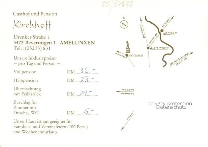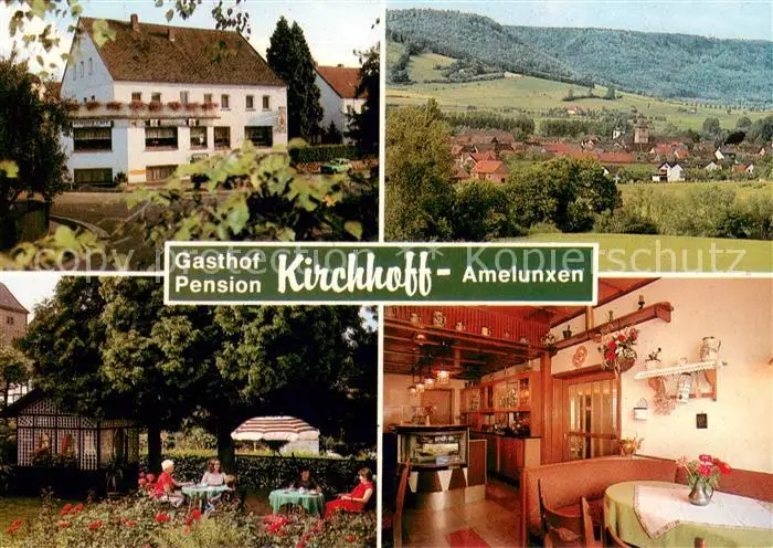 Amelunxen Gasthof Pension Kirchhoff Gastraum Garten Ortsansicht mit Kirche Amelunxen postalisch nicht gelaufen nach 1965 Werbekarte (keine Postkarte) Erhaltung siehe scans [FriedD77] Werbekarte (keine Postkarte) Frierer