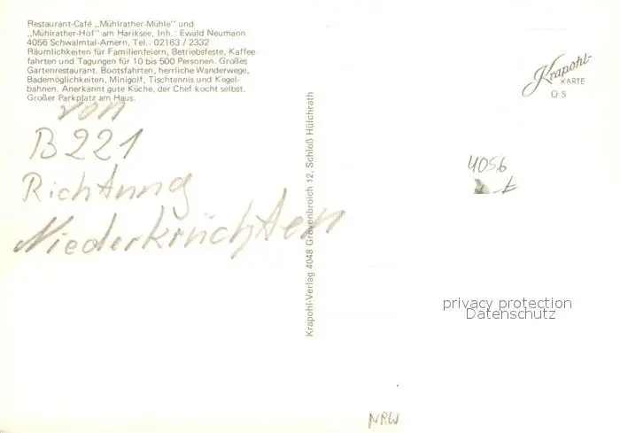 Amern Restaurant Café Muehlrather Muehle Kegelbahn Muehlrather Hof am Hariksee Boot Amern postalisch nicht gelaufen nach 1965 Erhaltung siehe scans [FriedD77] Frierer