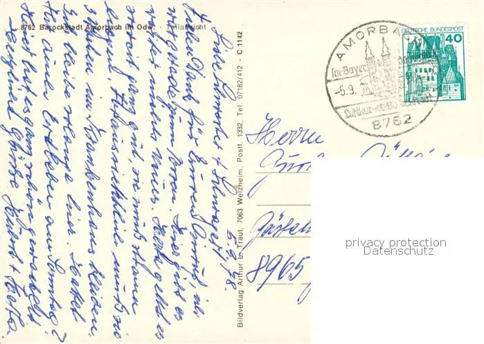 Amorbach_Miltenberg Ortsansicht mit Kirche Barockstadt im Odenwald postalisch gelaufen 1978 Erhaltung siehe scans [FriedD77] Frierer