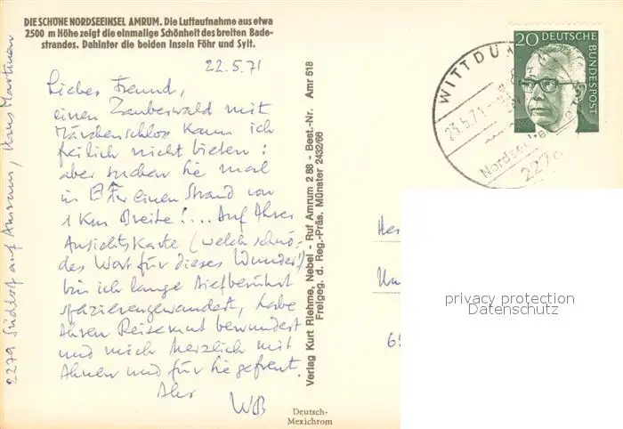 Amrum Fliegeraufnahme Badestrand m. Foehr u. Sylt Amrum postalisch gelaufen 1971 Erhaltung siehe scans [LiesaD40] LiesID40