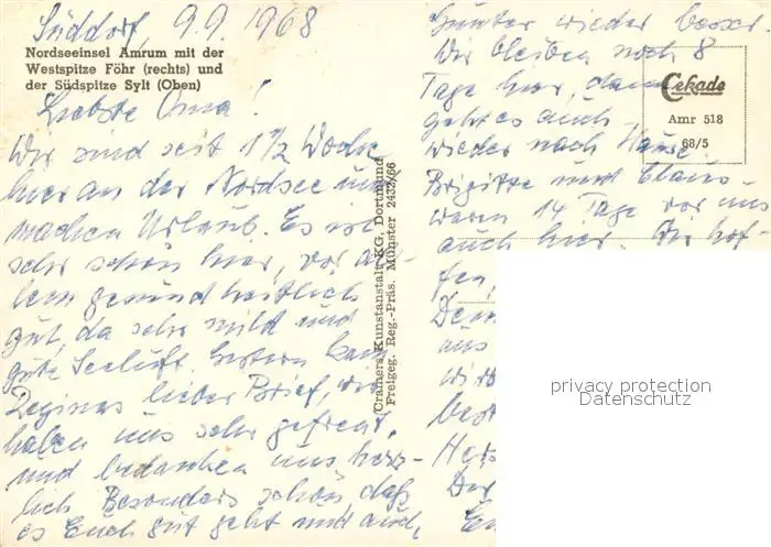 Amrum Fliegeraufnahme mit Westspitze Foehr und Suedspitze Sylt Amrum postalisch nicht gelaufen 1968 Erhaltung siehe scans [WerneD78] WernPID7