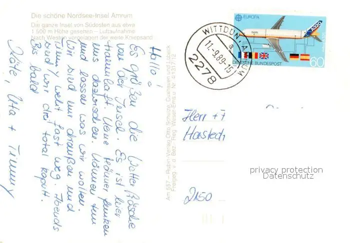 Amrum Nordseeinsel Kniepsand Fliegeraufnahme von Suedosten aus ca. 1500 m Hoehe Amrum postalisch gelaufen 1989 Erhaltung siehe scans [FriedD77] Frierer