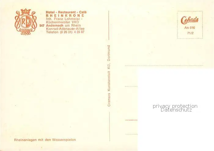 Andernach_Rhein Hotel Restaurant Cafe Rheinkrone Park Andernach Rhein postalisch nicht gelaufen nach 1965 Erhaltung siehe scans [FriedD77] Frierer