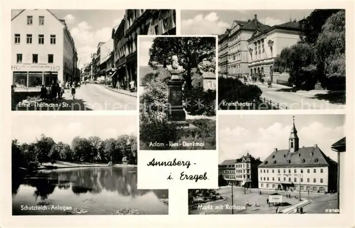 AK / Ansichtskarte Annaberg Buchholz_Erzgebirge Ernst Thaelmann Str Kreistheater Schutzteich Anlagen Markt mit Rathaus Annaberg Buchholz