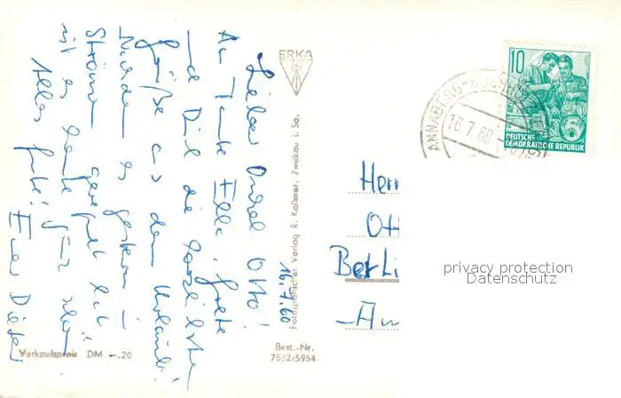 Annaberg-Buchholz_Erzgebirge Ernst Thaelmann Str Kreistheater Schutzteich Anlagen Markt mit Rathaus Annaberg-Buchholz postalisch gelaufen 1960 Erhaltung siehe scans [WerneD78] WernPID7