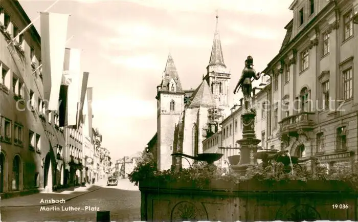 AK / Ansichtskarte Ansbach_Mittelfranken Martin Luther Platz mit Kirche und Brunnen Ansbach Mittelfranken