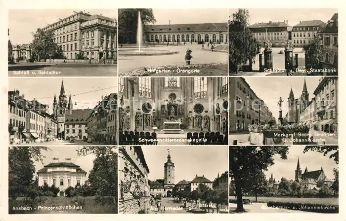 AK / Ansichtskarte Ansbach_Mittelfranken Schloss Martin Luther Platz Prinzenschloesschen Hofgarten Orangerie Kapelle Herrieder Tor Bayerische Staatsbank Brunnen Kirche Ansbach Mittelfranken