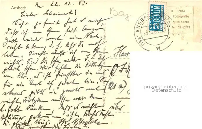 Ansbach_Mittelfranken Schloss Martin Luther Platz Prinzenschloesschen Hofgarten Orangerie Kapelle Herrieder Tor Bayerische Staatsbank Brunnen Kirche Ansbach Mittelfranken postalisch gelaufen 1953 Erhaltung siehe scans [FriedD77] Frierer