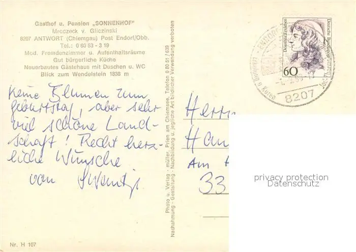 Antwort Ortsansicht mit Kirche Alpenblick Antwort postalisch gelaufen 1988 Erhaltung siehe scans [FriedD77] Frierer