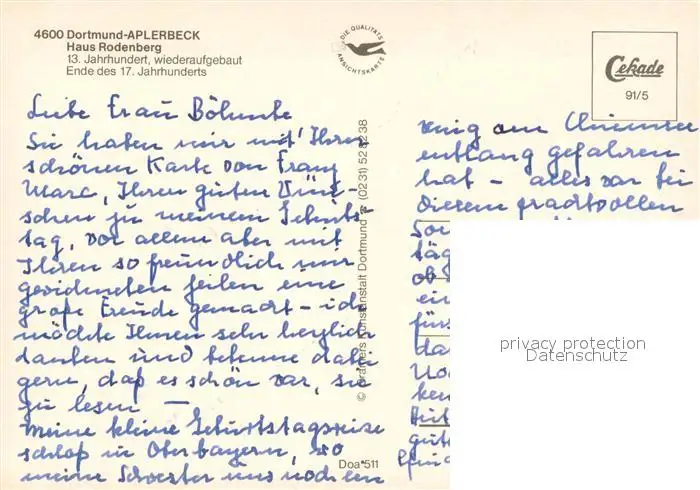 Aplerbeck Haus Rodenberg 13. Jhdt. Wasserschloss Aplerbeck postalisch nicht gelaufen 1991 Erhaltung siehe scans [FriedD77] Frierer