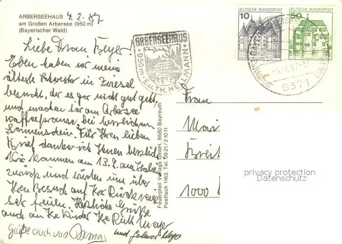 Arbersee Arberseehaus Arbersee postalisch gelaufen 1987 Erhaltung siehe scans [WerneD78] WernPID7