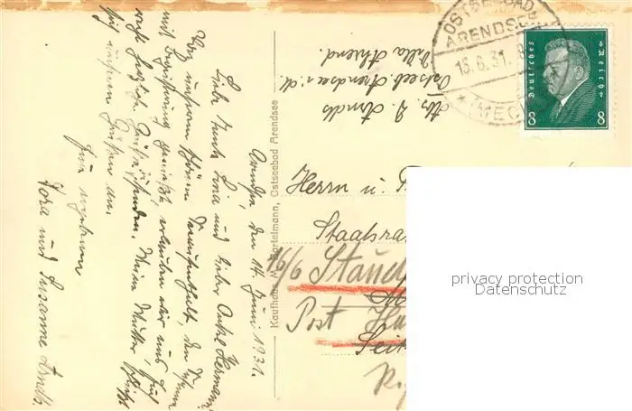 Arendsee_Ostsee Strandpromenade Ostseebad Arendsee_Ostsee postalisch gelaufen 1931 Erhaltung siehe scans [FriedD77] Frierer