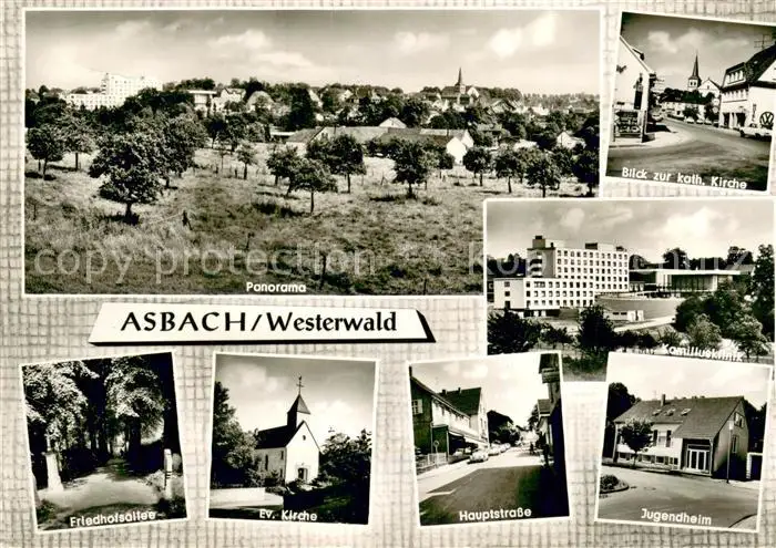 AK / Ansichtskarte Asbach_Westerwald Panorama Kath Kirche Kamillusklinik Friedhofsallee Ev Kirche Hauptstrasse Jugendheim Asbach_Westerwald