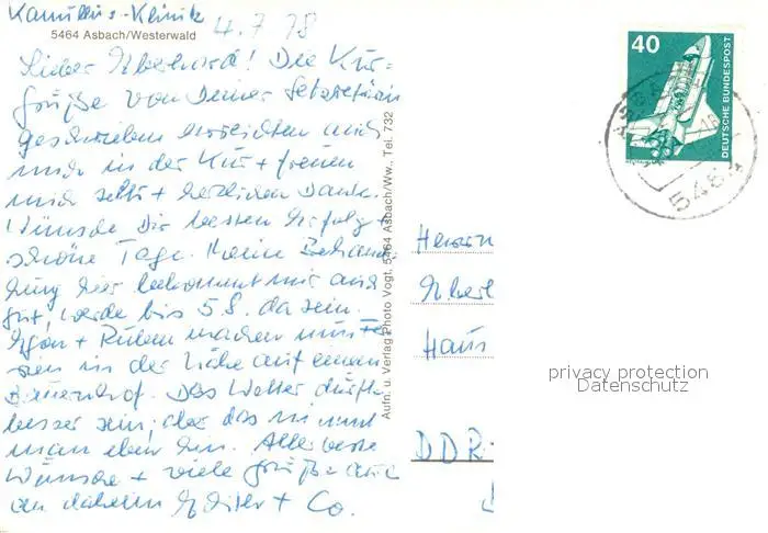 Asbach_Westerwald Panorama Kath Kirche Kamillusklinik Friedhofsallee Ev Kirche Hauptstrasse Jugendheim Asbach_Westerwald postalisch gelaufen 1978 Erhaltung siehe scans [WerneD78] WernPID7