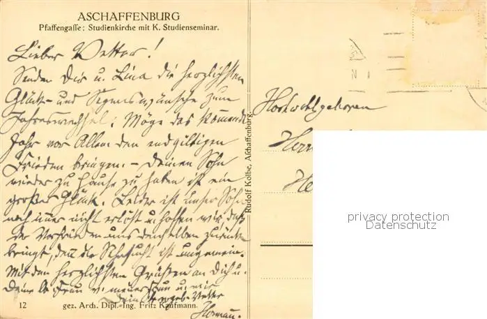 Aschaffenburg_Main Pfaffengasse Studienkirche mit K. Studienseminar Kuenstlerkarte Aschaffenburg Main postalisch gelaufen 1921-1965 Erhaltung siehe scans [FriedD77] Frierer