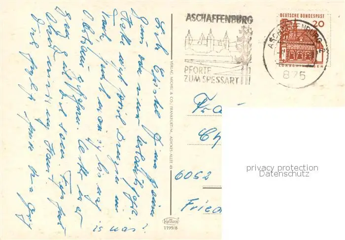 Aschaffenburg_Main Pompejanum Stadtpanorama Uferpromenade Schloss Hauptbahnhof Wappen Aschaffenburg Main postalisch gelaufen 1970 Erhaltung siehe scans [FriedD77] Frierer