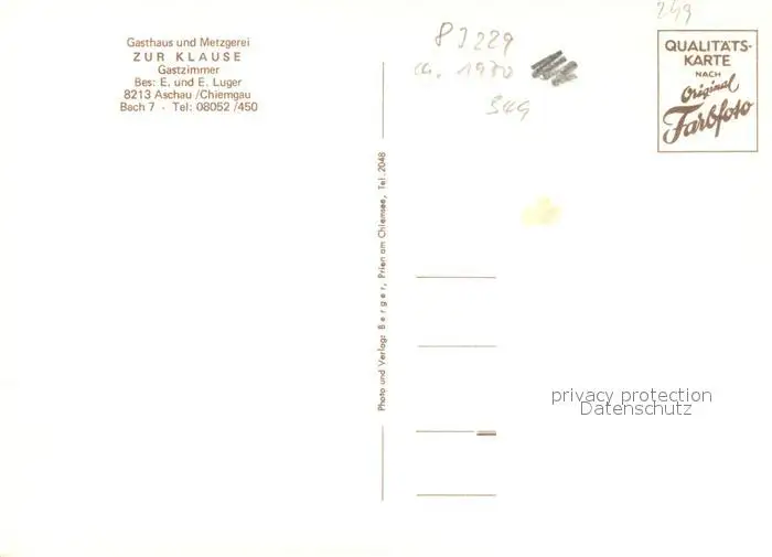 Aschau_Chiemgau Gasthaus Metzgerei Zur Klause Gastzimmer Aschau Chiemgau postalisch nicht gelaufen nach 1965 Erhaltung siehe scans [FriedD77] Frierer