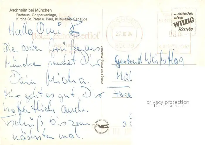 Aschheim Rathaus Golfparkanlage Kirche St Peter und Paul Kulturelles Gebaeude Aschheim postalisch gelaufen 1994 Erhaltung siehe scans [WerneD78] WernPID7