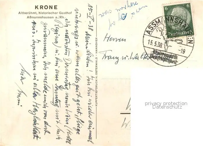 Assmannshausen Gasthaus Krone Assmannshausen postalisch gelaufen 1938 Erhaltung siehe scans [LiesaD40] LiesID40