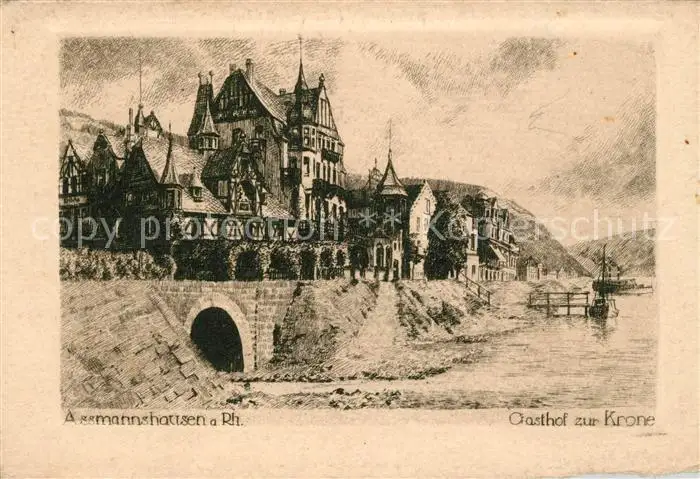 Assmannshausen_Rhein Gasthof zur Krone Radierung Assmannshausen Rhein postalisch nicht gelaufen bis 1920 Erhaltung siehe scans [WerneD78] WernPID7
