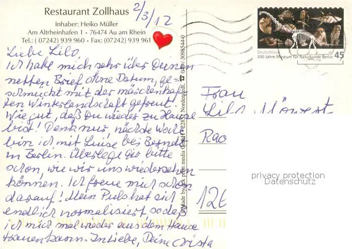 Au_Rhein Restaurant Zollhaus Rheinpartie Au_Rhein postalisch gelaufen 2012 Erhaltung siehe scans [WerneD78] WernPID7