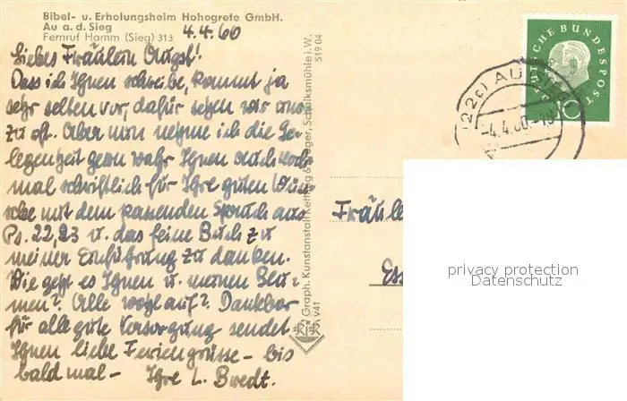 Au_Siegkreis Bibel und Erholungsheim Hohegrete Au_Siegkreis postalisch gelaufen 1960 Erhaltung siehe scans [WerneD78] WernPID7