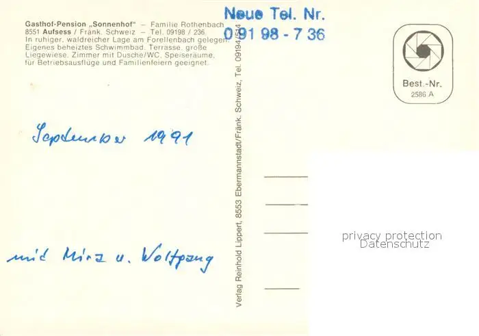 Aufsess Gasthof Pension Sonnenhof Aufsess postalisch nicht gelaufen 1991 Erhaltung siehe scans [FriedD77] Frierer