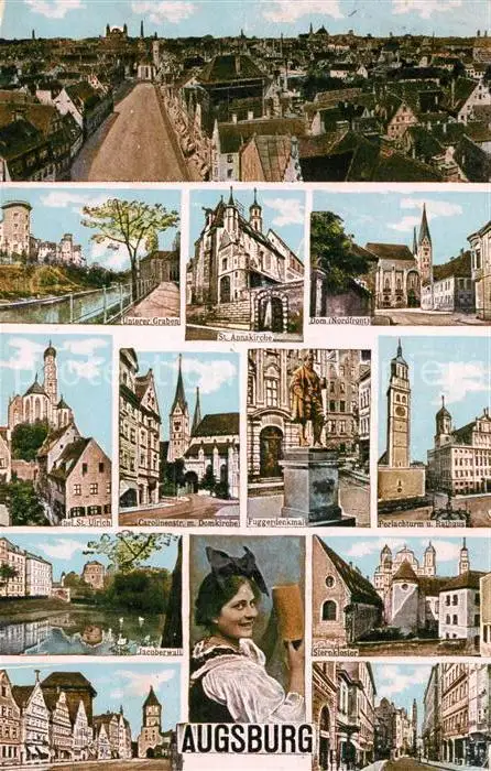 AK / Ansichtskarte Augsburg Unterer Graben St Annakirche St Ulrich Domkirche Fuggerdenkmal Perlachturm Jacoberwall Sternkloster Augsburg