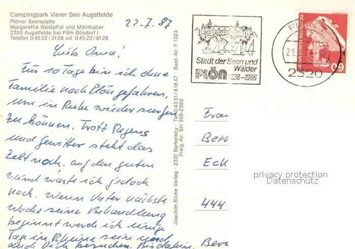 Augstfelde Campingpark Vierer See Ploener Seenplatte Holsteinische Schweiz Fliegeraufnahme postalisch gelaufen 1987 Erhaltung siehe scans [FriedD77] Frierer