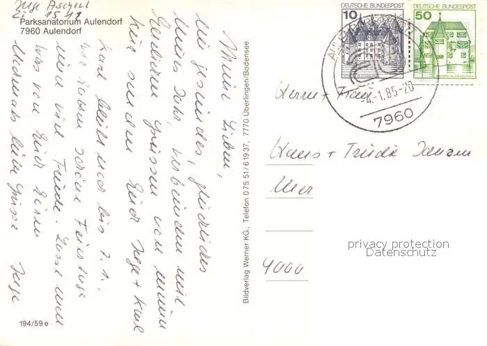 Aulendorf Parksanatorium Wasserspiele Wassergymnastik Foyer Speiserestaurant Aulendorf postalisch gelaufen 1985 Erhaltung siehe scans [FriedD77] Frierer
