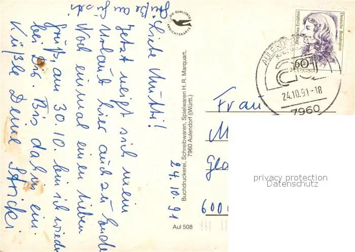 Aulendorf Schloss Hochkreuzkapelle Pfarrkirche Parksanatorium Kurpark Chronik Aulendorf postalisch gelaufen 1991 Erhaltung siehe scans [FriedD77] Frierer