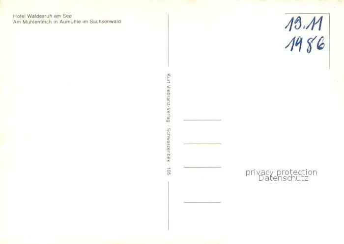 Aumuehle_Lauenburg Hotel Waldesruh am See Muehlenteich Aumuehle_Lauenburg postalisch nicht gelaufen 1986 Erhaltung siehe scans [FriedD77] Frierer