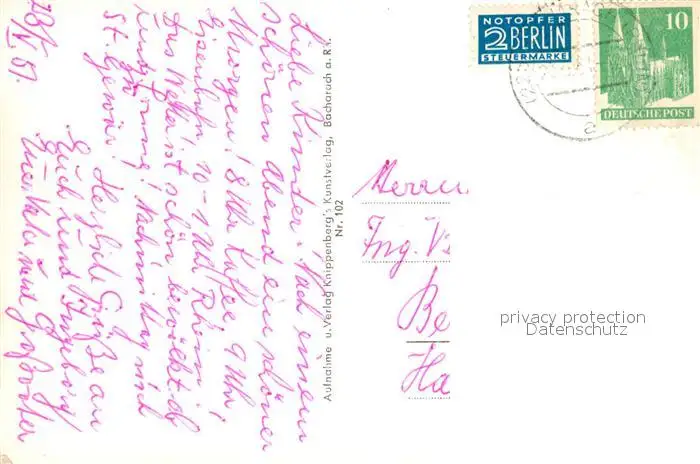 Bacharach_Rhein Hotel Herbrecht Bacharach Rhein postalisch gelaufen 1951 Erhaltung siehe scans [NatalD47] NataID47