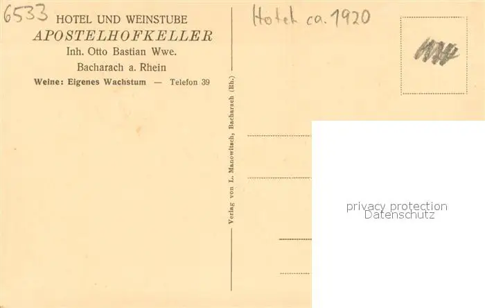 Bacharach_Rhein Hotel und Weinstube Apostelhofkeller Bacharach Rhein postalisch nicht gelaufen 1920 Erhaltung siehe scans [WerneD78] WernPID7