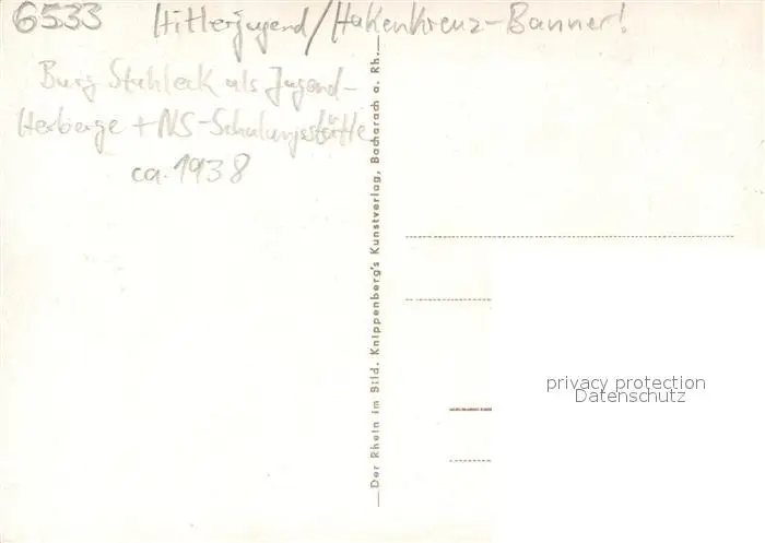 Bacharach_Rhein Jugendburg Stahleck Hitlerjugend Hakenkreuzbanner Bacharach Rhein postalisch nicht gelaufen 1938 Erhaltung siehe scans [FriedD77] Frierer