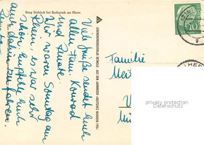 Bacharach_Rhein Jugendherberge Burg Stahleck Blick auf den Rhein Bacharach Rhein postalisch gelaufen 1921-1965 Erhaltung siehe scans [FriedD77] Frierer