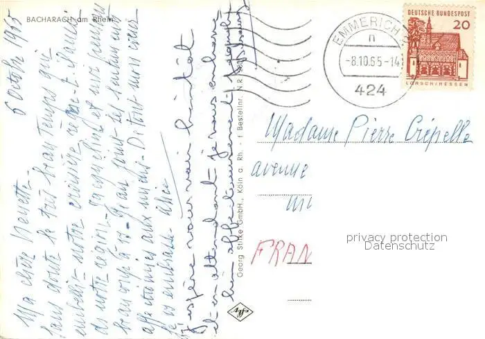 Bacharach_Rhein Stadtpanorama mit Blick ueber den Rhein Weinberge Bacharach Rhein postalisch gelaufen 1965 Erhaltung siehe scans [FriedD77] Frierer