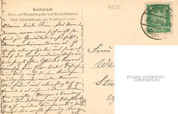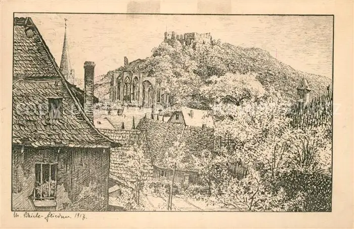 Bacharach_Rhein Wernerkapelle und Ruine Stahleck Federzeichnung Bacharach Rhein postalisch gelaufen 1926 Erhaltung siehe scans [FriedD77] Frierer