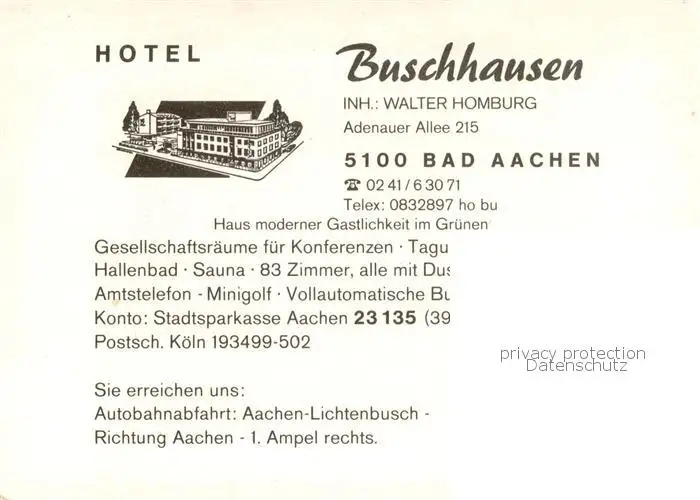 Bad_Aachen Hotel Buschhausen Teilasnichten m. Minigolfanlage u. Hallenbad Bad_Aachen postalisch nicht gelaufen nach 1965 Werbekarte (keine Postkarte) Erhaltung siehe scans [LiesaD40] Werbekarte (keine Postkarte) LiesID40
