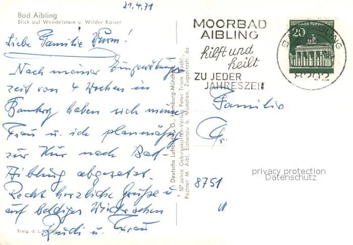 Bad_Aibling Fliegeraufnahme mit Wendelstein und Wilder Kaiser Bad_Aibling postalisch gelaufen 1971 Erhaltung siehe scans [WerneD78] WernPID7