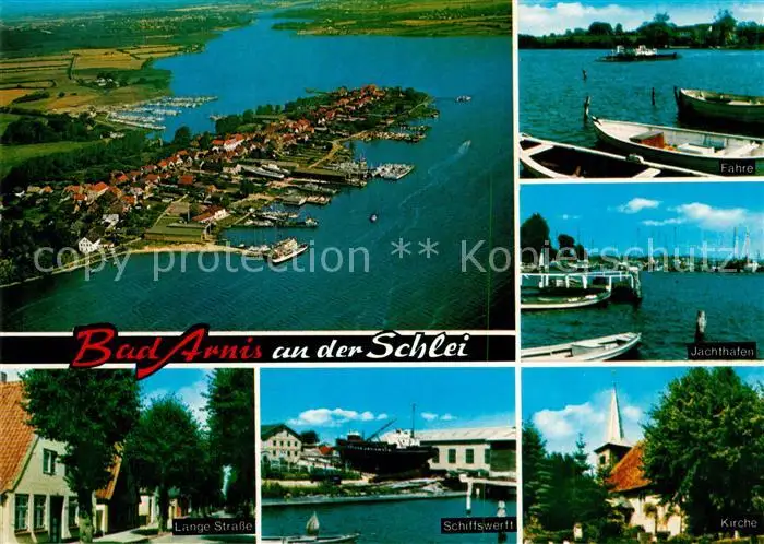 Bad_Arnis_Schlei Fliegeraufnahme Faehre Jachthafen Lange Str Schiffswerft Kirche Bad_Arnis_Schlei postalisch nicht gelaufen 1921-1965 Erhaltung siehe scans [WerneD78] WernPID7