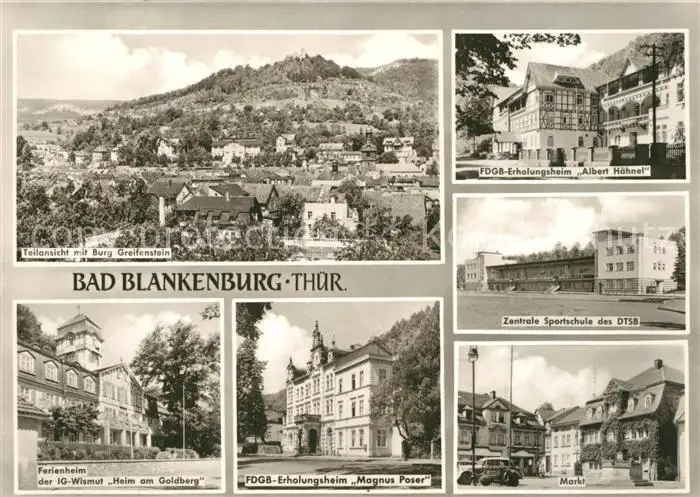 Bad_Blankenburg Teilansicht mit Burg Greifenstein FDGB Erholungsheime Albert Haehnel und Magnus Poser Heim am Goldberg Markt Bad_Blankenburg postalisch gelaufen 1964 Erhaltung siehe scans [WerneD78] WernPID7