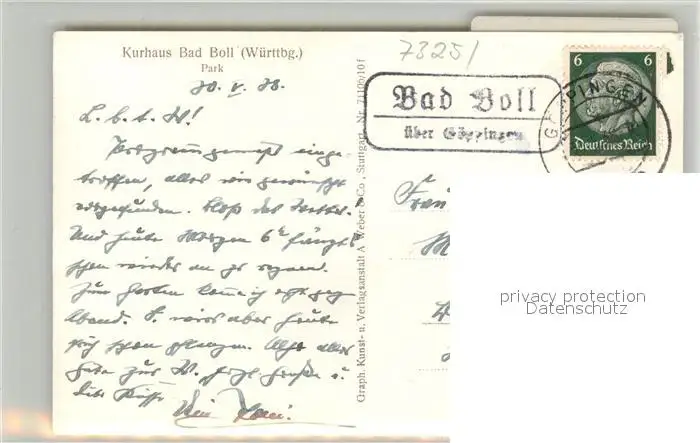 Bad_Boll Kurhaus Park Stempel Posthilfstelle Bad_Boll postalisch gelaufen 1938 Erhaltung siehe scans [FriedD77] Frierer