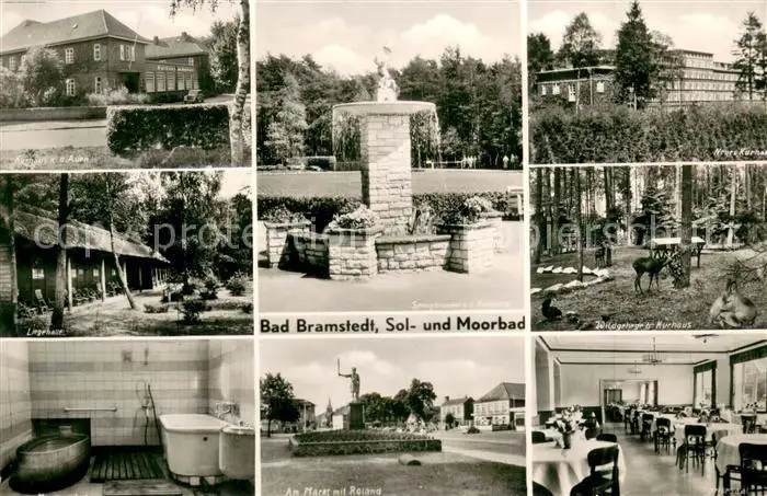 AK / Ansichtskarte Bad_Bramstedt Kurhaus Liegehalle Moorbad Springbrunnen Markt mit Roland Neues Kurhaus Wildgehege Speisesaal Bad_Bramstedt