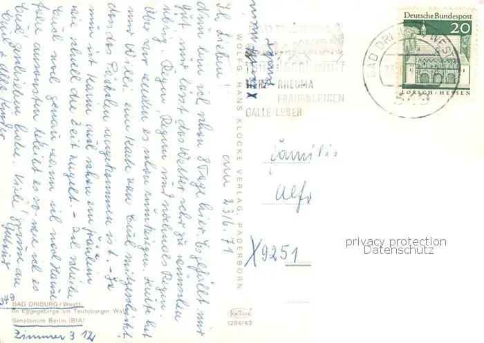 Bad_Driburg Sanatorium Berlin der BfA Bad_Driburg postalisch gelaufen 1971 Erhaltung siehe scans [WerneD78] WernPID7