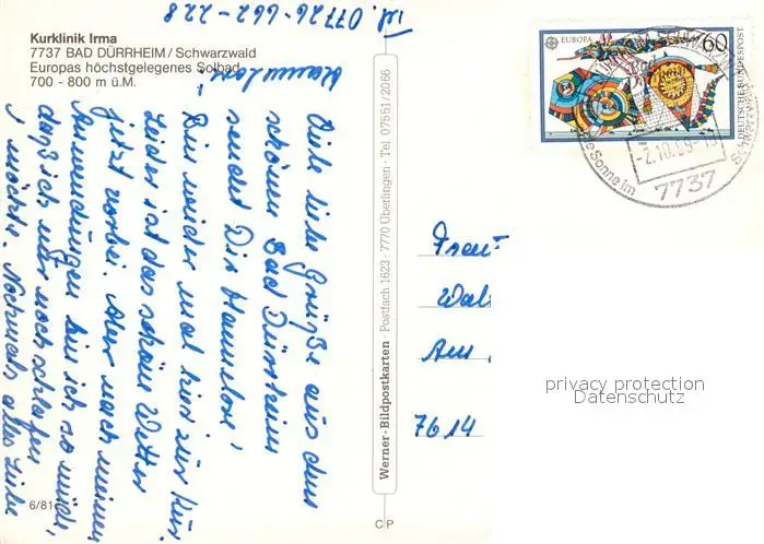 Bad_Duerrheim Kurklinik Irma Europas hoechstgelegenes Solbad Bad_Duerrheim postalisch gelaufen 1989 Erhaltung siehe scans [FriedD77] Frierer